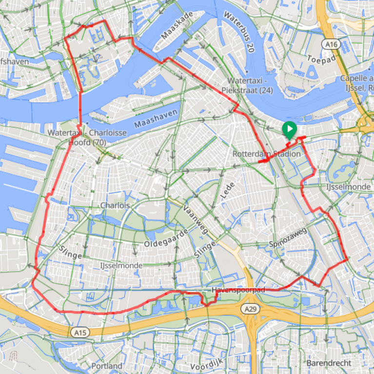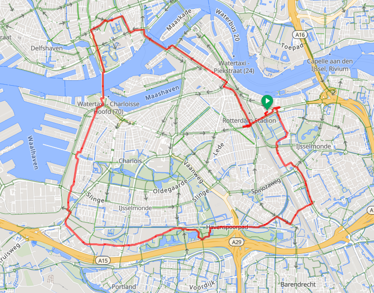 De 70 kilometer lange route voert je langs diverse hoogtepunten. Je start voor het Stadion van Feyenoord en zet koers richting de iconische Erasmusbrug. Vervolgens gaat de route verder naar de Beneluxtunnel, de 1300 meter lange onderdoorgang onder de Nieuwe Maas tussen Rotterdam en Schiedam. Daarna rijd je door naar Voorne-Putten en de Hoeksche Waard, waar je kunt genieten van het schitterende landschap. Na een prachtige rit keer je terug bij De Kuip, waar je bij de finish nog kunt napraten over de ervaring.