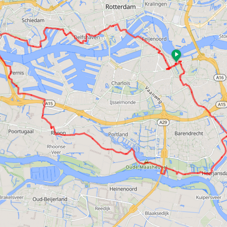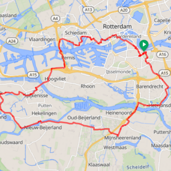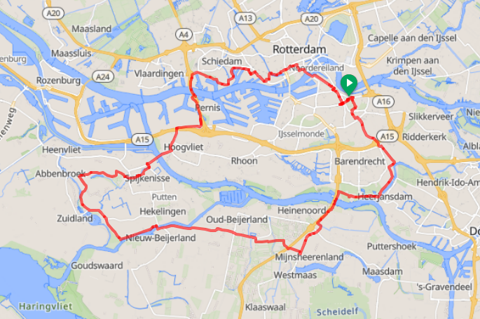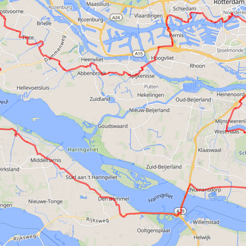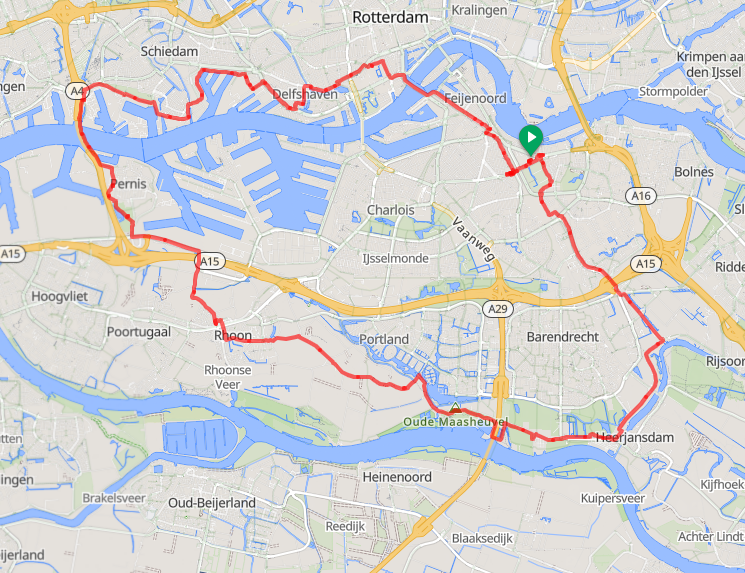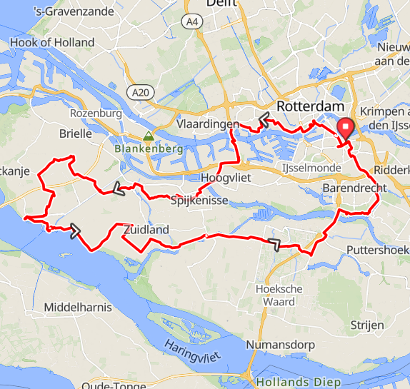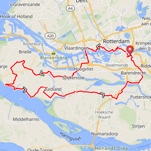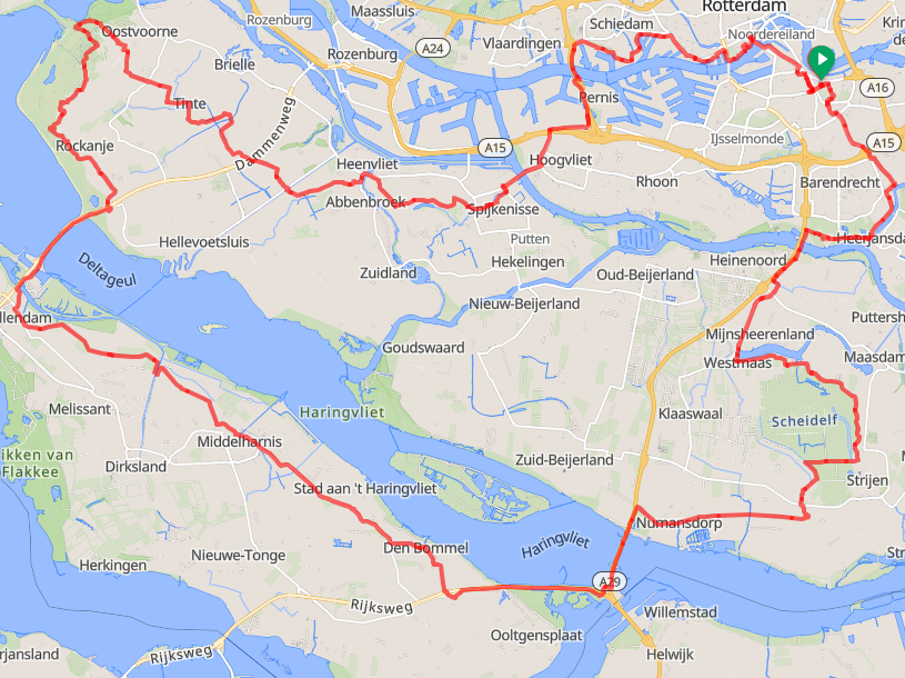 De 150 kilometer lange route neemt je mee langs diverse hoogtepunten. Je vertrekt vanaf het Stadion van Feyenoord en fietst over de iconische Erasmusbrug. Vervolgens gaat de route via de Beneluxtunnel, de 1300 meter lange onderdoorgang onder de Nieuwe Maas tussen Rotterdam en Schiedam. Je passeert Rockanje, een sfeervolle badplaats aan de Noordzeekust, en steekt daarna het Haringvliet over via de Haringvlietdam, een indrukwekkende waterkering van 5 kilometer lang. Verder voert de route je langs Goeree-Overflakkee, de Haringvlietbrug en het prachtige natuurgebied Oudeland van Strijen.
