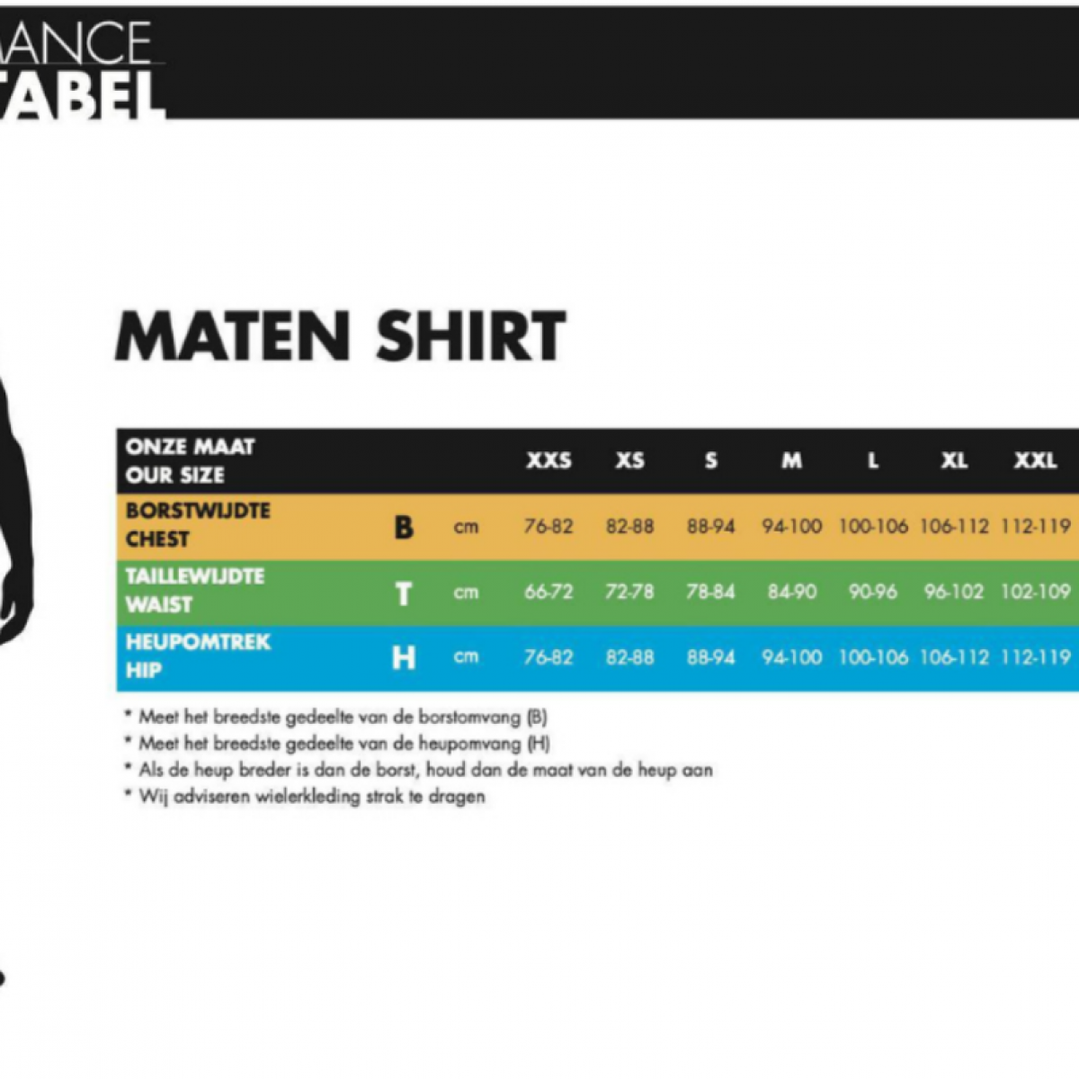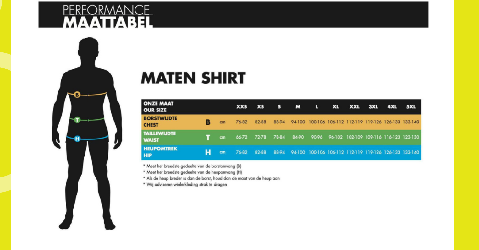 Het wielershirt valt klein. Vind je een wielershirt al snel te strak of te kort? Bestel dan een maat groter dan de maattabel aangeeft.
