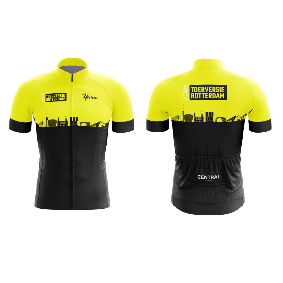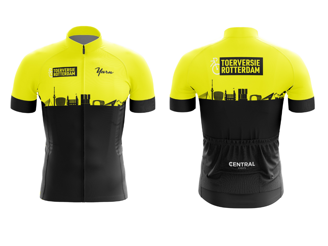 We zijn dit jaar overgegaan naar het Performance wielershirt van Yarn! Hierboven zie je het ontwerp van het wielershirt van de Toerversie Rotterdam 2025. Het wielershirt is optioneel bij te bestellen tijdens jou inschrijving voor €42,95, de eerste 50 stuks kosten maarliefst €37,95.
